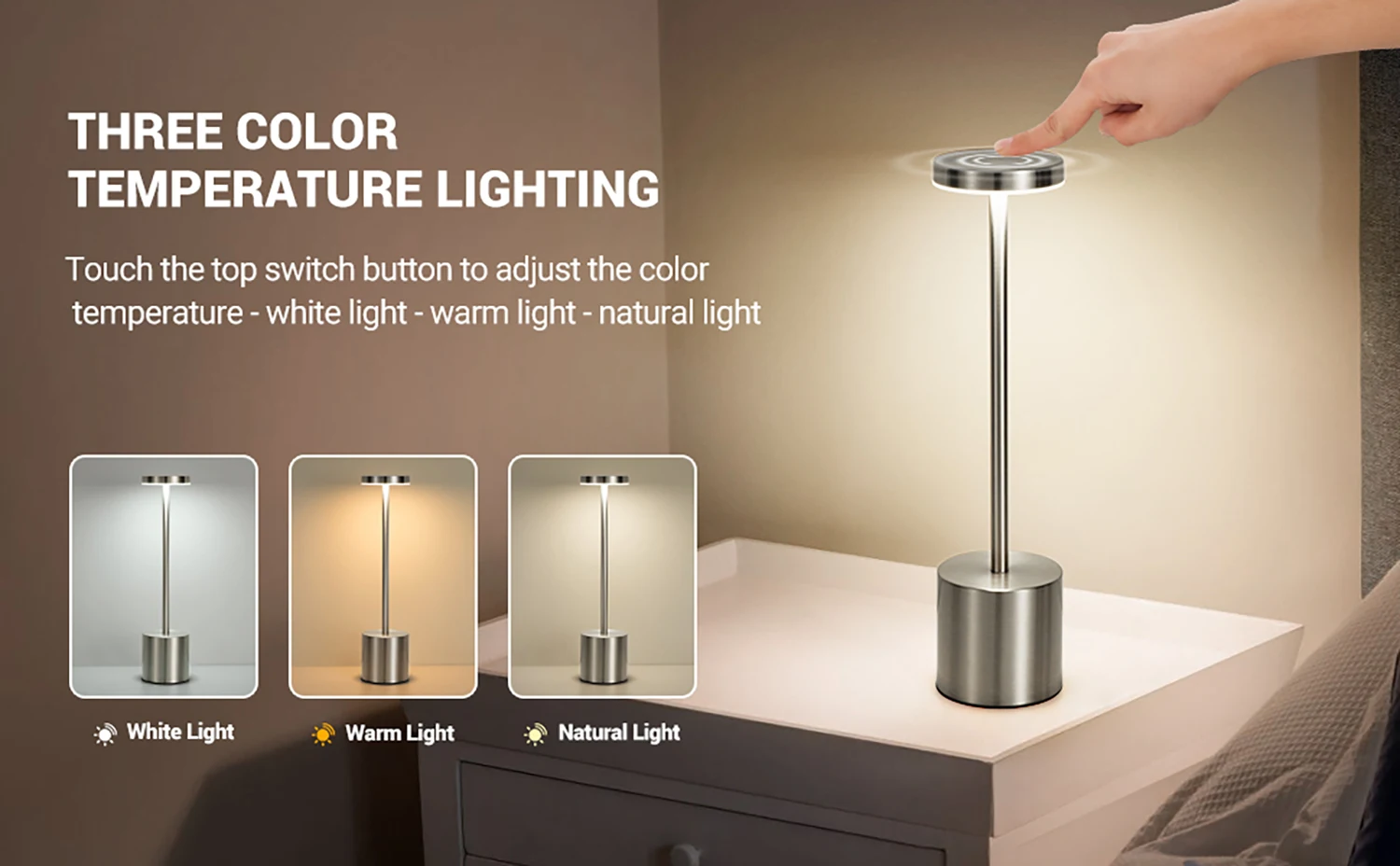 Luz do console de toque: a lâmpada de mesa LED de metal pode alternar 3 cores claras (amarelo quente/branco quente/luz neutra) por toque, e cada cor de luz pode ser ajustada sem limitação de luz como desejar (escurecimento contínuo).Graças ao seu design simples e alta qualidade, oferece o toque perfeito e é um verdadeiro candeeiro de mesa portátil que chama a atenção